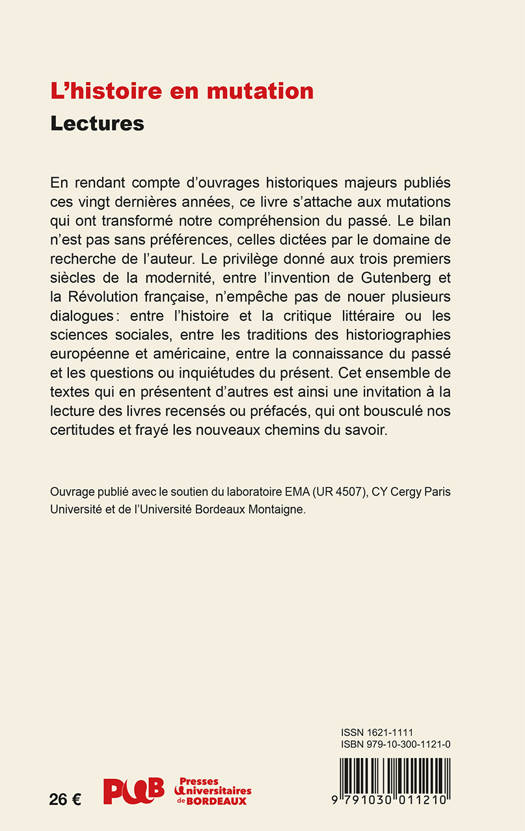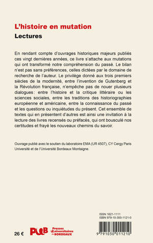 En rendant compte d'ouvrages historiques majeurs publiés ces vingt dernières années, ce livre s'attache aux mutations qui ont transformé notre compréhension du passé. Le bilan n'est pas sans préférences, celles dictées par le domaine de recherche de l'auteur. Le privilège donné aux trois premiers siècles de la modernité, entre l'invention de Gutenberg et la Révolution française, n'empêche pas de nouer plusieurs dialogues : entre l'histoire et la critique littéraire ou les sciences sociales, entre les traditions des historiographies européenne et américaine, entre la connaissance du passé et les questions ou inquiétudes du présent. Cet ensemble de textes qui en présentent d'autres est ainsi une invitation à la lecture des livres recensés ou préfacés, qui ont bousculé nos certitudes et frayé les nouveaux chemins du savoir.
