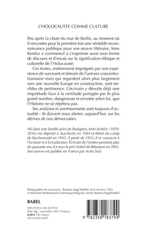 Peu après la chute du mur de Berlin, au moment où il rencontre pour la première fois une véritable reconnaissance publique pour son oeuvre littéraire, Imre Kertész a commencé à s'exprimer aussi sous forme de discours et d'essais sur la signification éthique et culturelle de l'Holocauste. Ces textes, entièrement imprégnés par son expérience de survivant et témoin de l'univers concentrationnaire mais qui regardent alors plus largement vers une nouvelle Europe en construction, sont terribles de pertinence. L'écrivain y dévoile déjà une inquiétude face à la certitude partagée par le plus grand nombre, dangereuse et erronée selon lui, que l'Histoire ne se répétera pas. Ses analyses et avertissements sont toujours d'actualité : ils doivent nous alerter, aujourd'hui, sur les dérives de nos démocraties.