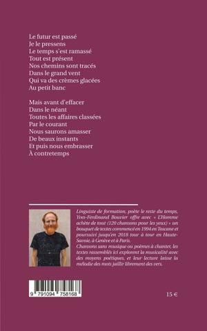 Le futur est passé Je le pressens Le temps s’est ramassé Tout est présent Nos chemins sont tracés Dans le grand vent Qui va des crèmes glacées Au petit banc