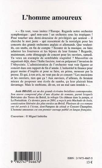 "En tout, vous imitez l'Europe. Regarde notre orchestre symphonique : quel non-sens! Un orchestre sous les tropiques! Pour toucher une demi-douzaine de privilégiés qui sentent -il cherche le mot juste- qui ressentent de la nostalgie pour les concerts des grands orchestres anglais et allemands. Que veulent-ils, ces snobs, en fin de compte? Ecouter de la musique, ou faire admirer les fourrures et les bijoux de leur femme? Regarde, maintenant, cette démagogie de concert pour les ouvriers, samedi....". Assis Brasil est un des grands écrivains brésiliens contemporains. Ce roman est son premier publié en langue française.