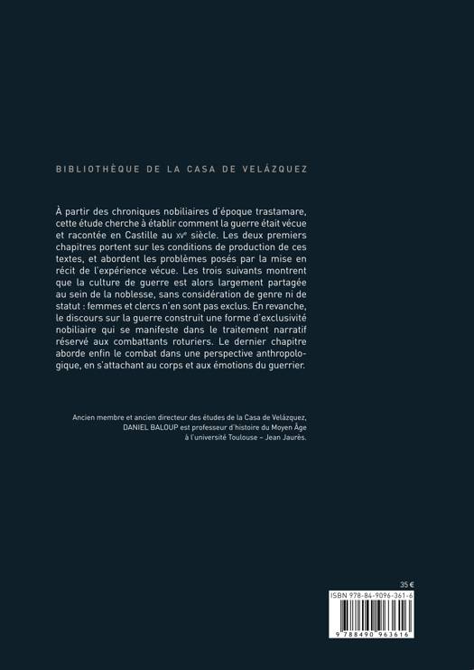 À partir des chroniques nobiliaires d'époque trastamare, cette étude cherche à établir comment la guerre était vécue et racontée en Castille au XVe siècle. Les deux premiers chapitres portent sur les conditions de production de ces textes, et abordent les problèmes posés par la mise en récit de l'expérience vécue. Les trois suivants montrent que la culture de guerre est alors largement partagée au sein de la noblesse, sans considération de genre ni de statut: femmes et clercs n'en sont pas exclus. En revanche, le discours sur la guerre construit une forme d'exclusivité nobiliaire qui se manifeste dans le traitement narratif réservé aux combattants roturiers. Le dernier chapitre aborde enfin le combat dans une perspective anthropologique, en s'attachant au corps et aux émotions du guerrier.