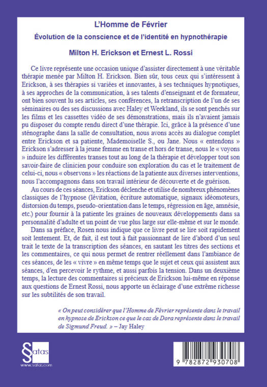 Ce livre représente une occasion unique d'assister directement à une véritable thérapie menée par Milton H. Erickson. Bien sûr, tous ceux qui s'intéressent à Erickson, à ses thérapies si variées et innovantes, à ses techniques hypnotiques, à ses approches de la communication, à ses talents d'enseignant et de formateur, ont bien souvent lu ses articles, ses conférences, la retranscription de l'un de ses séminaires ou des ses discussions avec Haley et Weekland, ils se sont penchés sur les films et les cassettes vidéo de ses démonstrations, mais ils n'avaient jamais pu disposer du compte rendu direct d'une thérapie. Ici, grâce à la présence d'une sténographe dans la salle de consultation, nous avons accès au dialogue complet entre Erickson et sa patiente, Mademoiselle S., ou Jane. Nous "entendons" Erickson s'adresser à la jeune femme en transe et hors de transe, nous le "voyons" induire les différentes transes tout au long de la thérapie et développer tout son savoir-faire de clinicien pour conduire son exploration du cas et le traitement de celui-ci, nous "observons" les réactions de la patiente aux diverses interventions, nous l'accompagnons dans son travail intérieur de découverte et de guérison. Au cours de ces séances, Erickson déclenche et utilise de nombreux phénomènes classiques de l'hypnose (lévitation, écriture automatique, signaux idéomoteurs, distorsion du temps, pseudo-orientation dans le temps, régression en âge, amnésie, etc.) pour fournir à la patiente les graines de nouveaux développements dans sa personnalité d'adulte et un point de vue plus large sur elle-même et sur le monde.