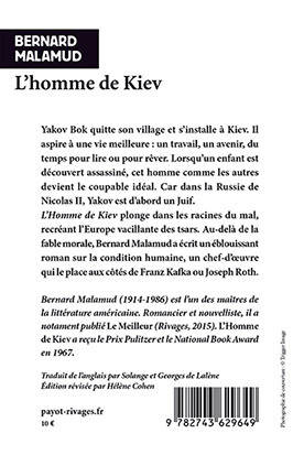 L'Homme de Kiev plonge dans les racines du mal, recréant l'Europe vacillante des tsars. Au- delà de la fable morale, Bernard Malamud a écrit un éblouissant roman sur la condition humaine, un chef-d'oeuvre qui le place aux côtés de Franz Kafka ou Joseph Roth.
