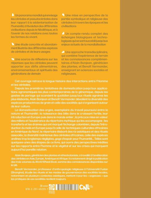 Un panorama mondial qui envisage les cereales et pseudocereales dans leur rapport a la sedentarisation de l'humanite, a l'evolution des differentes civilisations depuis le Neolithique, et a l'avenir de nos relations avec toutes les formes du vivant. Une etude concrete et abondamment illustree des differentes especes de cereales et de leurs usages Une source de reflexions sur les reponses que les cereales peuvent apporter aux defis alimentaires, environnementaux et spirituels des generations de demain Une mise en perspective de la portee symbolique et religieuse des cereales a travers les epoques et les civilisations- Un compte-rendu complet des echanges biologiques et technologiques qui se sont succede jusqu'aux enjeux actuels de la mondialisation Une approche transdisciplinaire, qui combine l'experience de terrain et les connaissances complementaires d'Alain Bonjean, geneticien des plantes, et Benoit Vermander, enseignant en sciences sociales et religieuses. Cet ouvrage retrace la longue histoire des interactions entre l'Homme et les cereales. Depuis les premieres tentatives de domestication jusqu'aux applications agronomiques les plus contemporaines de la genomique, depuis les gestes de partage qui scandent le quotidien jusqu'aux rituels agraires les plus elabores, Alain Bonjean et Benoit Vermander devoilent la diversite des especes productrices de grain et celle des societes qui s'organisent autour de leur culture. La domestication des orges, exemplaire du travail poursuivi entre la nature et l'humanite; la naissance des bles dans le croissant fertile, leur introduction en Europe puis dans le monde entier; la precoce mise en valeur des millets et l'exuberance du repertoire mythique qui les accompagne; les transferts et les drames qui ont marque l'echange colombien, depuis l'introduction du mais en Europe jusqu'a celle de techniques culturales africaines en Amerique du Nord; le repertoire elabore des riz asiatiques et des rituels associes; la diversite maintenue des cereales africaines, celle des especes andines trop longtemps negligees, gage d'espoir pour l'humanite... Telles sont quelques-unes des etapes de ce livre, qui ouvre des perspectives inedites sur les rapports entre l'homme et le vegetal et sur les crises qui marquent aujourd'hui pareille relation.