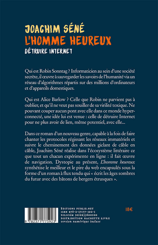 Dans ce roman d'un nouveau genre, capable à la fois de faire chanter les protocoles régissant les réseaux immatériels et suivre le cheminement des données giclant de câble en câble, Joachim Séné réalise dans l'écosystème littéraire ce que tout un chacun expérimente en ligne : il fait oeuvre de navigation. Dystopie au présent, L'homme heureux synthétise le meilleur et le pire du web encapsulés sous la forme d'un roman à flux tendu qui "écrit les âges sombre du futur avec des bâtons de bergers étrusques".