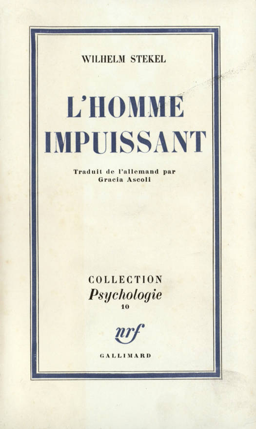 L'impuissance est un mal très répandu, en particulier chez les intellectuels. Ce mal est souvent la cause de drames navrants. En effet, "l'homme impuissant, à l'encontre de la femme frigide, se sent infériorisé, la femme restant femme malgré tout et fière même parfois de cette insensibilité ; lui, il souffre en mâle de cette incapacité physique". Une grande partie des hypocondres, des envieux, des solitaires, des originaux, des ermites, se recrute parmi les hommes impuissants. Dans son ouvrage, Wilhelm Stekel, après une analyse très poussée des divers aspects de l'impuissance et une sérieuse recherche de ses causes, après une impressionnante série d'observations médicales, aboutit à la conclusion que l'impuissance ne se soigne pas par des traitements physiques, chimiques et thérapeutiques ; dans l'immense majorité des cas, c'est une souffrance psychique, un déséquilibre mental qui se soignent et se guérissent par des moyens psychiques.