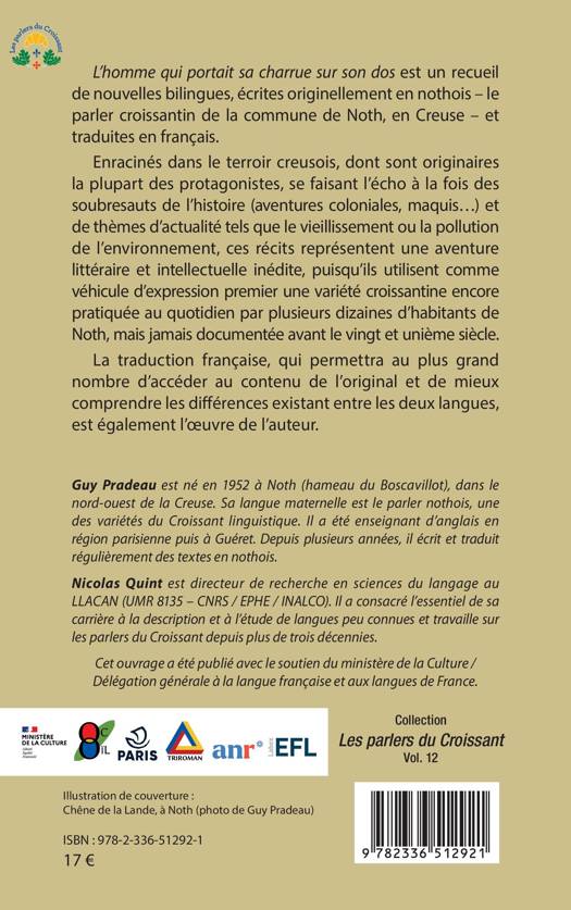 L’homme qui portait sa charrue sur son dos est un recueil de nouvelles bilingues, écrites originellement en nothois – le parler croissantin de la commune de Noth, en Creuse – et traduites en français. Enracinés dans le terroir creusois, dont sont originaires la plupart des protagonistes, se faisant l’écho à la fois des soubresauts de l’histoire (aventures coloniales, maquis…) et de thèmes d’actualité tels que le vieillissement ou la pollution de l’environnement, ces récits représentent une aventure littéraire et intellectuelle inédite, puisqu’ils utilisent comme véhicule d’expression premier une variété croissantine encore pratiquée au quotidien par plusieurs dizaines d’habitants de Noth, mais jamais documentée avant le vingt et unième siècle. La traduction française, qui permettra au plus grand nombre d’accéder au contenu de l’original et de mieux comprendre les différences existant entre les deux langues, est également l’œuvre de l’auteur.