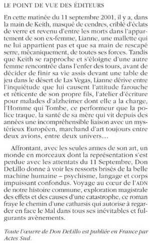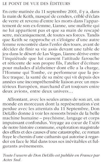 En cette matinée du 11 septembre 2001, il y a, dans la main de Keith, masqué de cendres, criblé d'éclats de verre et revenu d'entre les morts dans l'appartement de son ex-femme, Lianne, une mallette qui ne lui appartient pas et que sa main de rescapé serre, mécaniquement, de toutes ses forces. Tandis que Keith se rapproche et s'éloigne d'une autre femme rencontrée dans l'enfer des tours, avant de décider de finir sa vie assis devant une table de jeu dans le désert de Las Vegas, Lianne dérive entre l'inquiétude que lui causent l'attitude farouche et réticente de son propre fils, l'atelier d'écriture pour malades d'alzheimer dont elle a la charge, l'Homme qui Tombe, ce performeur que la police traque, la santé de sa mère qui vit depuis des années une incompréhensible liaison avec un mystérieux Européen, marchand d'art toujours entre deux avions, entre deux univers... Affrontant, avec les seules armes de son art, un monde en morceaux dont la représentation s'est perdue avec les attentats du 11 Septembre, Don DeLillo donne à voir les ressorts brisés de la belle machine humaine - psychisme, langage et corps impuissant confondus. Voyage au coeur de l'ADN de notre histoire commune, exploration magistrale des effets et des causes d'une catastrophe, ce roman fraye le chemin d'une catharsis qui autorise à regarder en face le Mal dans tous ses inévitables et fulgurants avènements.