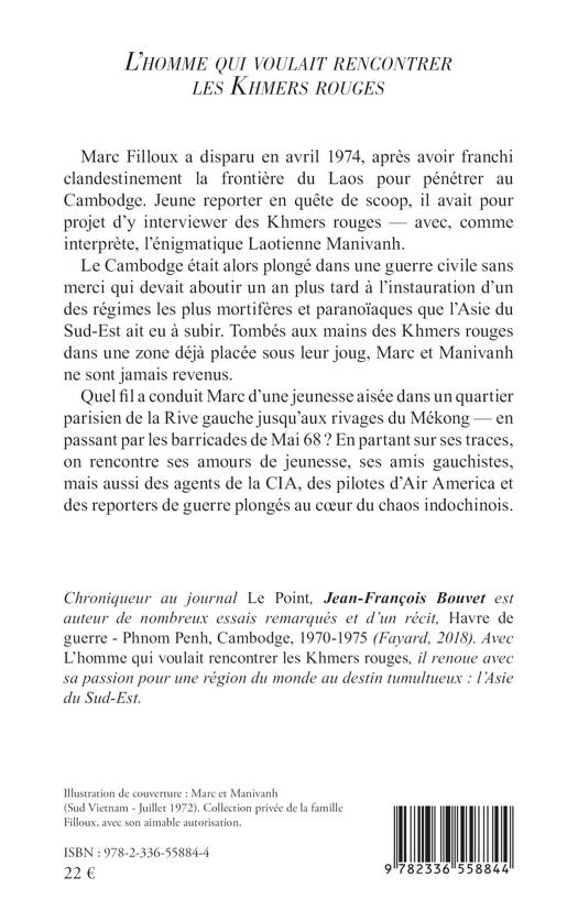 Marc Filloux a disparu en avril 1974, après avoir franchi clandestinement la frontière du Laos pour pénétrer au Cambodge. Jeune reporter en quête de scoop, il avait pour projet d'y interviewer des Khmers rouges - avec, comme interprète, l'énigmatique Laotienne Manivanh. Le Cambodge était alors plongé dans une guerre civile sans merci qui devait aboutir un an plus tard à l'instauration d'un des régimes les plus mortifères et paranoïaques que l'Asie du Sud-Est ait eu à subir. Tombés aux mains des Khmers rouges dans une zone déjà placée sous leur joug, Marc et Manivanh ne sont jamais revenus. Quel fil a conduit Marc d'une jeunesse aisée dans un quartier parisien de la Rive gauche jusqu'aux rivages du Mékong - en passant par les barricades de Mai 68 ? En partant sur ses traces, on rencontre ses amours de jeunesse, ses amis gauchistes, mais aussi des agents de la CIA, des pilotes d'Air America et des reporters de guerre plongés au coeur du chaos indochinois.