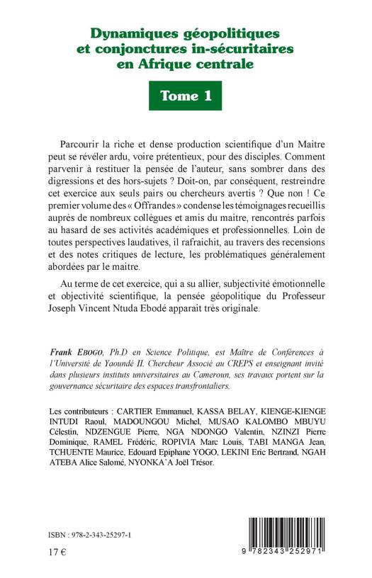 Parcourir la riche et dense production scientifique d'un Maitre peut se révéler ardu, voire prétentieux, pour des disciples. Comment parvenir à restituer la pensée de l'auteur, sans sombrer dans des digressions et des hors-sujets ? Doit-on, par conséquent, restreindre cet exercice aux seuls pairs ou chercheurs avertis ? Que non ! Ce premier volume des « Offrandes » condense les témoignages recueillis auprès de nombreux collègues et amis du maitre, rencontrés parfois au hasard de ses activités académiques et professionnelles. Au terme de cet exercice, qui a su allier, subjectivité émotionnelle et objectivité scientifique, la pensée géopolitique du Professeur Joseph Vincent Ntuda Ebodé apparait très originale.