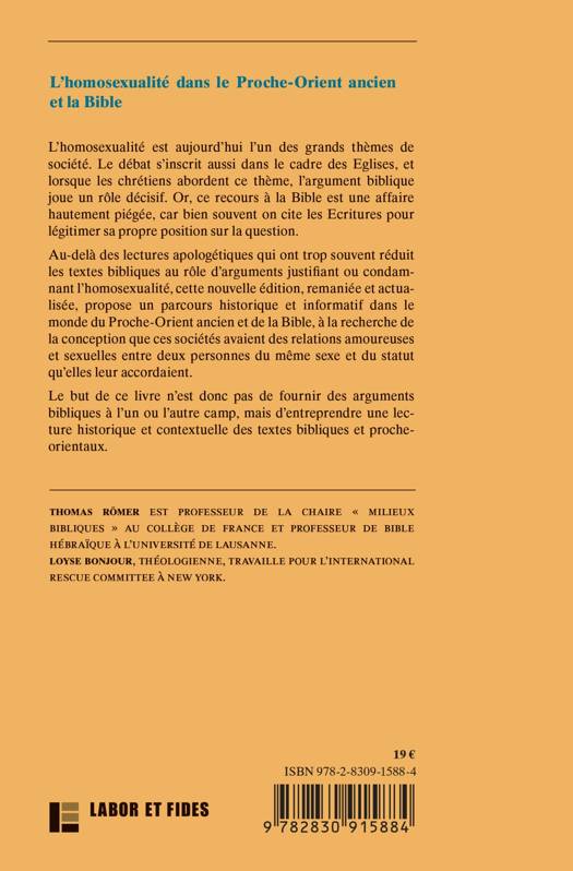 L'?homosexualité est aujourd'?hui un des grands thèmes de société. Le débat s'?inscrit aussi dans le cadre des Églises, et lorsque les chrétiens abordent ce thème, l'?argument biblique joue un rôle décisif. Or, ce recours à la Bible est une affaire hautement piégée, car bien souvent on cite les Écritures pour légitimer sa propre position sur la question. Au-delà des lectures apologétiques qui ont trop souvent réduit les textes bibliques au rôle d?'arguments justifiant ou condamnant l?'homosexualité, cette nouvelle édition, remaniée et actualisée, propose un parcours historique et informatif dans le monde du Proche-Orient ancien et de la Bible, à la recherche de la conception que ces sociétés avaient des relations amoureuses et sexuelles entre deux personnes du même sexe et du statut qu?'elles leur accordaient.