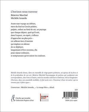 Une peintre, Michèle Iznardo. Une poète, Béatrice Marchal. Michèle Iznardo donne, dans un ensemble de vingt-quatre peintures, un aperçu de la force et de la profondeur de son art. Béatrice Marchal l’accompagne de poèmes qui soulignent une correspondance, chez l’une et l’autre, entre les mondes extérieur et intérieur, réel et imaginaire. L’horizon, dans son essentielle mobilité, s’y fait accès vers « l’inconnu/ d’une vie autre/ qui ne renonce pas/ à faire signe ».