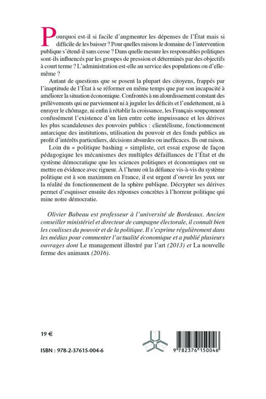 Loin du « politique bashing » simpliste, cet essai expose de façon pédagogique les mécanismes des multiples défaillances de l’État et du système démocratique que les sciences politiques et économiques ont su mettre en évidence avec rigueur. A l’heure où la défiance vis-à-vis du système politique est à son maximum en France, il est urgent d’ouvrir les yeux sur la réalité du fonctionnement de la sphère publique. Décrypter ses dérives permet d’esquisser ensuite des réponses concrètes à l’horreur politique qui mine notre démocratie.