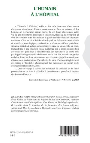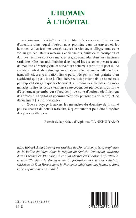 L'humain à l'hôpital, voilà le titre très évocateur d'un roman d'aventure dans lequel l'auteur nous promène dans un univers où les hommes et les femmes censés sauver la vie, tuent allègrement cette vie au gré des intérêts matériels et financiers, fruits de la corruption et dont les victimes sont des malades et garde-malades dans les structures sanitaires. C'est un récit linéaire dans lequel les événements sont relatés de manière chronologique et suivant un schéma narratif qui part d'une situation initiale de calme apparent (Zeze mène sa vie en ville en toute tranquillité), à une situation finale perturbée par la mort gratuite d'un accidenté qui périt face à l'indifférence des personnels de santé mus par l'appétit du gain qu'ils obtiennent sur le dos des malades et garde-malades. Entre les deux situations se succèdent des péripéties sous forme d'événement perturbateur (l'accident), de suite d'actions (déploiement des frères à l'hôpital et cheminement des personnels de santé) et de dénouement (la mort de Zeze). ... Que ce voyage à travers les méandres du domaine de la santé pousse chacun de nous à réfléchir, à questionner et peut-être à espérer des jours meilleurs . Extrait de la préface d'Alphonse TA'NKHU YAMO