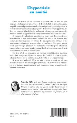 Dans un monde où les relations humaines sont de plus en plus fragiles, L'hypocrisie en amitié de Djamila Sidi se présente comme un guide essentiel pour décrypter les dynamiques toxiques qui peuvent se cacher derrière des sourires et des gestes de bienveillance apparente. Ce livre est un appel à la vigilance, mais aussi à la sagesse, en exposant les diverses formes d'hypocrisie qui empoisonnent les relations amicales. À travers des chapitres analytiques, basés sur des expériences personnelles et des observations culturelles profondes, l'auteur met en lumière les trahisons invisibles, les manipulations subtiles et les motivations cachées qui peuvent miner la confiance. Plus qu'un simple essai, cet ouvrage propose des solutions concrètes pour identifier, comprendre et surmonter ces formes de duplicité, tout en ouvrant la voie à des amitiés sincères et authentiques. Ce livre n'est pas seulement un outil de sensibilisation, c'est une invitation à repenser l'essence même de l'amitié, à construire des relations basées sur la transparence, la loyauté, et le respect mutuel. Si vous avez déjà été déçu par une relation amicale ou si vous cherchez à cultiver des amitiés plus profondes, L'hypocrisie en amitié est une lecture incontournable qui changera votre perception des relations humaines.