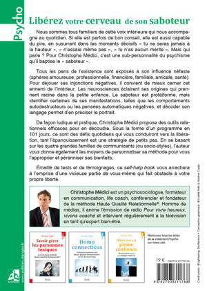 Nous sommes tous familiers de cette voix intérieure qui nous accompagne au quotidien. Si elle est parfois de bon conseil, elle est aussi capable du pire, en susurrant dans les moments décisifs « tu ne seras jamais à la hauteur », « n’essaie même pas », « tu n’as aucun mérite ». Mais qui parle ? Pour Christophe Médici, c’est une sub-personnalité du psychisme qu’il baptise le « saboteur ». Tous les pans de l’existence sont exposés à son influence néfaste (sphères amoureuse, professionnelle, financière, familiale, amicale, santé). Pour déjouer ses injonctions négatives, il convient de mieux cerner cet ennemi de l’intérieur. Les neurosciences éclairent ses origines qui prennent racine dans la petite enfance. Le saboteur est protéiforme, mais identifier certaines de ses manifestations, telles que les comportements autodestructeurs ou les pensées automatiques négatives, et décoder son langage permet d’en préciser le portrait. De façon ludique et pratique, Christophe Médici propose des outils relationnels efficaces pour en découdre. Sous la forme d’un programme en 101 jours, ce sont des défis quotidiens qui vous conduiront vers la libération, tant l’épanouissement est une stratégie de petits pas. En se basant sur les quatre grandes familles de communicants (ou socio-styles), l’auteur vous donne également les moyens de personnaliser sa méthode pour vous l’approprier et pérenniser ses bienfaits. Émaillé de tests et de témoignages, ce self-help book vous arrachera à l’emprise d’une vicieuse partie de vous-même qui fait obstacle à votre propre liberté.