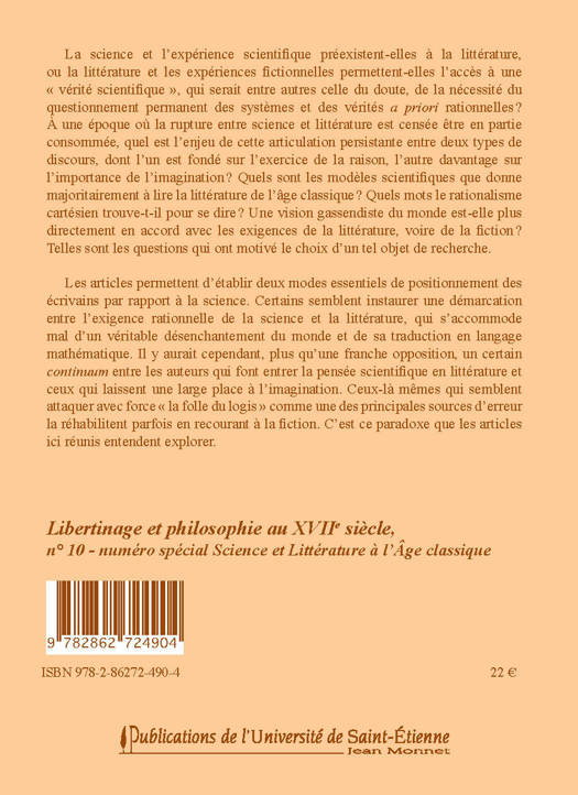 Les articles réunis ici s'interrogent sur le positionnement des écrivains du XVIIe siècle par rapport à la science. Ils confrontent les auteurs qui ont fait entrer la pensée scientifique en littérature à ceux qui ont instauré une démarcation entre l'exigence rationnelle de la science et la littérature, qui s'accommode mal d'une désillusion du monde se traduisant en langage mathématique.
