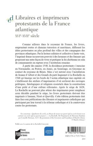Comme ailleurs dans le royaume de France, les livres, empruntant routes et chemins terrestres et maritimes, diffusent les idées protestantes au plus profond des villes et des campagnes des provinces atlantiques. Par la lecture solitaire et collective à haute voix, l'imprimé donne un nouveau pouvoir à des hommes et des femmes qui proposent une autre façon de vivre et pratiquer la foi chrétienne au sein de communautés en rupture avec l'institution romaine. A partir des années 1540, la dissidence protestante s'enracine en Normandie, en Poitou, en Aunis, en Saintonge, en Guyenne au contact du royaume de Béarn. Mais c'est surtout avec l'installation de Jeanne d'Albret et des Grands du parti huguenot à La Rochelle en 1568 qu'émerge sur les bords de l'océan atlantique une capitale où s'établissent des ateliers d'imprimeries d'où sortiront des ouvrages politiques, théologiques et religieux essentiels dans la construction d'une piété et d'une culture réformées. Après le siège de 1628, La Rochelle ne pouvant plus attirer des imprimeurs pour remplacer ceux décédés pendant le siège, les livres protestants doivent être imprimés à Saumur, Niort et Quevilly. Cette édition protestante doit faire face aux publications des libraires et imprimeurs catholiques qui participent par leur travail à la réforme catholique et à la controverse contre les protestants.