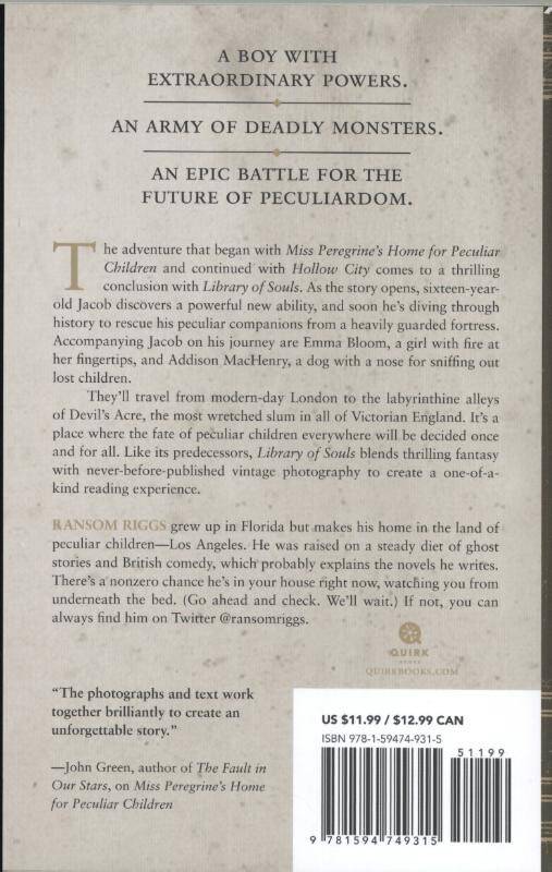 Library of Souls for its unique world, fast action, satisfying answers and a thorough tying up of loose ends."--