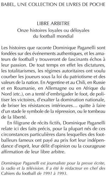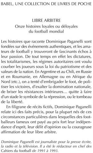 Les histoires que raconte Dominique Paganelli sont fondées sur des événements authentiques, et les amateurs de football y trouveront de fascinants échos à leur passion. De tout temps en effet les dictatures, les totalitarismes, les régimes autoritaires ont voulu courber les joueurs sous la loi du patriotisme et des valeurs de la nation. En Argentine et au Chili, en Russie et en Roumanie, en Allemagne ou en Afrique du Nord (etc.), on a tenté d'embrigader le foot, de politiser les victoires, d'exalter la domination nationale, de briser les résistances intérieures... quitte à faire d'un stade le symbole de la répression, ou le tombeau de la liberté. En filigrane de récits fictifs, Dominique Paganelli relate ici des faits précis, pour la plupart nés de ces circonstances particulières dans lesquelles des footballeurs fameux ont payé au prix fort leur indépendance d'esprit, leur délit d'opinion ou la courageuse affirmation de leur libre arbitre.