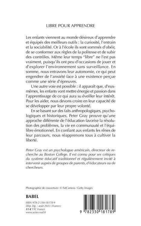 Les enfants viennent au monde désireux d'apprendre et équipés des meilleurs outils : la curiosité, l'entrain et la sociabilité. Or à l'école ils sont sommés d'obéir, de se conformer aux règles de la politesse et de subir des contrôles. Même leur temps "libre" ne l'est pas vraiment, puisqu'ils ont peu d'occasions de jouer et d'explorer l'environnement sans surveillance. En somme, nous entravons leur autonomie, ce qui peut engendrer de l'anxiété face à une existence perçue comme une série d'épreuves. Une autre voie est possible : il apparaît que, d'eux-mêmes, les enfants vont mettre énergie et passion dans l'apprentissage de ce qui aura su éveiller leur intérêt. Pour les aider, nous devons croire en leur capacité de se développer par leur propre volonté. En se basant sur des faits anthropologiques, psychologiques et historiques, Peter Gray prouve qu'une approche différente de l'éducation favorise la résolution des problèmes, la vie en communauté et l'équilibre émotionnel. En confiant aux enfants les rênes de leur parcours, nous réapprenons tous à cultiver la liberté.