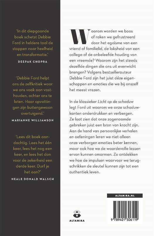 In 'Licht op de schaduw' legt bestsellerauteur Debbie Ford uit waarom we onze schaduwkanten onderdrukken en verbergen. Deze schaduwkanten zouden zogenaamde zwakheden laten zien, maar volgens Ford zijn dit helemaal geen zwakheden. Je schaduwkanten zijn juist kwaliteiten én een bron van kracht waar je uit kunt putten om jezelf beter te leren begrijpen. Aan de hand van oefeningen en persoonlijke verhalen leren we deze schaduwkanten en de emoties die erbij komen kijken kennen, evenals de lessen die zij ons kunnen én willen leren. Met haar unieke visie op en kennis van schaduwwerk geeft Ford je de tools om de gevoelens en kanten van jezelf waar je voor terugdeinst, te omarmen. 'Licht op de schaduw' is hét schaduwwerk-boek voor iedereen die zijn schaduwkant wil leren kennen.