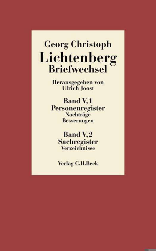 Die hochgerühmte Ausgabe des Briefwechsels Georg Christoph Lichtenbergs, "ein philologisches Muster- und Meisterstück" (FAZ), ist in den Jahren 1983 bis 1992 erschienen. Nun liegt mit den beiden umfangreichen Registerbänden ein Handwerkszeug vor, mit dem die Ausgabe erst wirklich erschlossen werden kann. Der erste Teilband enthält Addenda und Errata zu den vier Briefbänden, Lichtenbergs Postlisten aus seinen Tagebüchern, Apokrypha und andere Paralipomena, eine mit Vorgänger-Editionen vergleichende Nummern-Konkordanz und ein umfassendes erläuterndes Personen- und Schriftenregister mit über 5000 Stichwörtern und 1600 Verweisen. Der zweite Teilband enthält ein umfangreiches kommentierendes Sachregister mit über 15000 Stich- und Schlagwörtern und 5000 Querverweisen, ein chronologisches Verzeichnis aller in den Bänden I bis V enthaltenen Briefe, einen alphabetischen Korrespondentenkatalog, ein alphabetisches Verzeichnis der Korrespondenten nach ihren Orten und schließlich Pläne zur Topographie von Göttingen.
