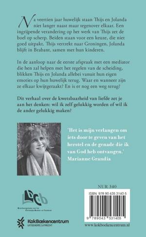'Lichtval' van Marianne Grandia is een novelle over de kwetsbaarheid van liefde, die je aan het denken zet: wil ik gelukkig worden of een ander gelukkig maken? Na veertien jaar huwelijk staan Thijs en Jolanda niet langer naast maar tegenover elkaar. Een ingrijpende verandering op het werk van Thijs zet de boel op scherp. Beiden staan voor een keuze, die niet goed uitpakt. Thijs vertrekt naar Groningen, Jolanda blijft in Brabant, samen met hun kinderen. In de aanloop naar de eerste afspraak met een mediator die hen zal helpen met het regelen van de scheiding, blikken Thijs en Jolanda allebei vanuit hun eigen emoties op hun huwelijk terug. Waar en wanneer zijn ze elkaar kwijtgeraakt? En is er nog een weg terug?
