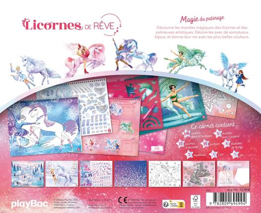 Un grand carnet créatif avec plus de 500 autocollants de Licornes, des pages de dessins, des coloriages, des pochoirs, des planches de motifs, des jeux et des modèles pour s’inspirer. L’enfant part à la découverte des mondes magiques des licornes et des patineuses, les habille de somptueux bijoux, et crée des décors merveilleux.