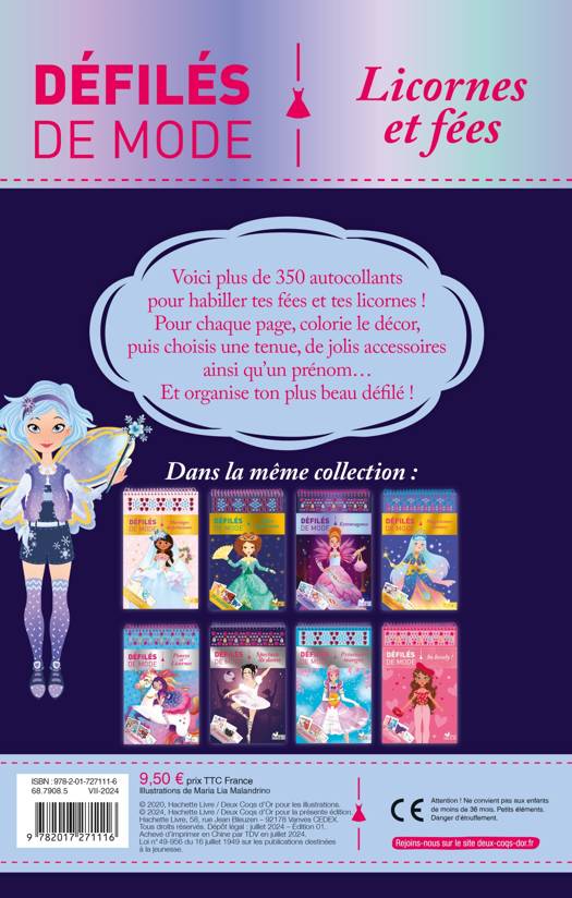 Un bloc à spirale avec 21 silhouettes à habiller grâce à 7 planches d'autocollants (dont une planche avec des détails argentés et une planche avec des détails pailletés), 1 planche de stickers accessoires et 2 planches de strass. Thématique : licornes et fées.