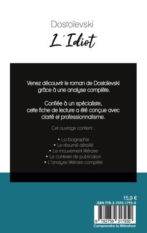 Venez découvrir L'Idiot de Dostoïevski grâce à une analyse littéraire de référence ! Confiée à un spécialiste, cette fiche de lecture a été conçue avec clarté et professionnalisme. Cet ouvrage contient la biographie de l'écrivain, le résumé détaillé, le mouvement littéraire, le contexte de publication de l'oeuvre et l'analyse complète. Retrouvez tous nos titres sur : www.fichedelecture.fr.