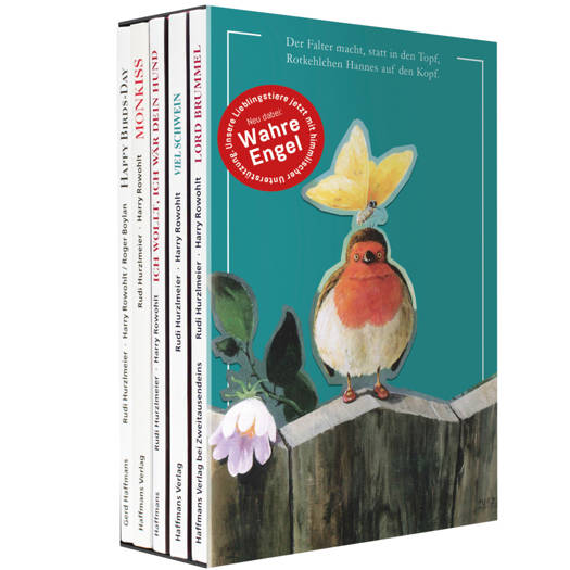 Liebenswürdige Vierbeiner und nahe Verwandte: Gleich mehrmals sind Rudi Hurzlmeier, Experte auf dem Gebiet der animalischen Malerei, und Zirkusdirektor Harry Rowohlt mit uns Gassi gegangen. Ausgewählte Höhepunkte von diesen Streifzügen wider den tierischen Ernst gibt es jetzt bei uns in einem Schuber zum tierisch guten Preis. Mit: Happy Birds-Day. »Eigentlich das ideale Geschenkbuch, nur dass man sich nie mehr von ihm trennen will« (Nürnberger Zeitung). 48 Seiten.- Ich wollt', ich wär dein Hund. 20 Farbtafeln, die jede/n Hundeliebhaber/in in freudig-erregtes Hecheln versetzen. 48 Seiten. - Lord Brummel. Über den Bären als Dandy. Er wohnt als möblierter Herr im Forst und betreibt das Nötigste: Pennen, Schlemmen, Süffeln, leichtes Wald-Golfen. 46 Seiten. - Miez miez. Heiße, süße Katzenbilder, die reichlich Anlass zum Schnurren bieten. 56 Seiten. - Monkiss. Wie viel Affe steckt im Menschen, fragt man sich nach Betrachten dieser Bilder. 64 Seiten. Jeweils fester Einband und Fadenheftung. Faunafreund, was willst Du mehr?