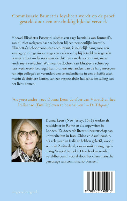 Hoewel Elisabetta Foscarini slechts een vage kennis is van Brunetti, kan hij niet weigeren haar te helpen bij een persoonlijke kwestie. Elisabetta’s schoonzoon, een accountant, is bang voor een aanslag op zijn gezin vanwege een zaak waar hij betrokken bij is geraakt. Brunetti doet onderzoek naar de cliënten van de accountant, maar vindt niets verdachts. Wanneer de dochter van Elisabetta echter op haar werk wordt bedreigd, moet Brunetti zelf de hulp inroepen van zijn collega’s en verandert een persoonlijke vriendendienst in een officiële zaak waarin de duistere kanten van een respectabele Italiaanse instelling aan het licht komen.