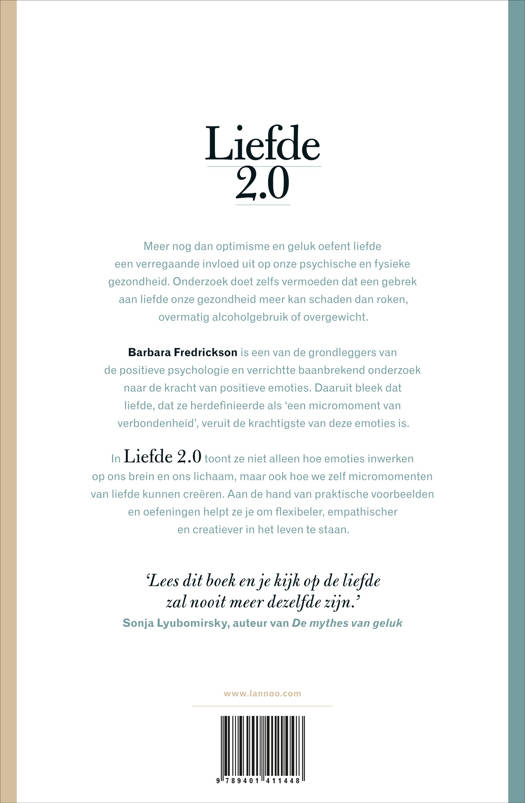 Een verrassende kijk op de liefde vanuit een biologisch perspectief Meer nog dan optimisme en geluk oefent liefde een verregaande invloed uit op onze psychische en fysieke gezondheid. Barbara Fredrickson verrichtte baanbrekend onderzoek naar de kracht van positieve emoties. Daaruit bleek dat liefde, dat ze herdefi nieerde als 'een micromoment van verbondenheid', veruit de krachtigstige van deze emoties is. In Liefde 2.0 toont ze niet alleen hoe emoties inwerken op ons brein en ons lichaam, maar ook hoe we zelf micromomenten van liefde kunnen creëren en hoe deze je flexibeler, empathischer en creatiever kunnen maken.
