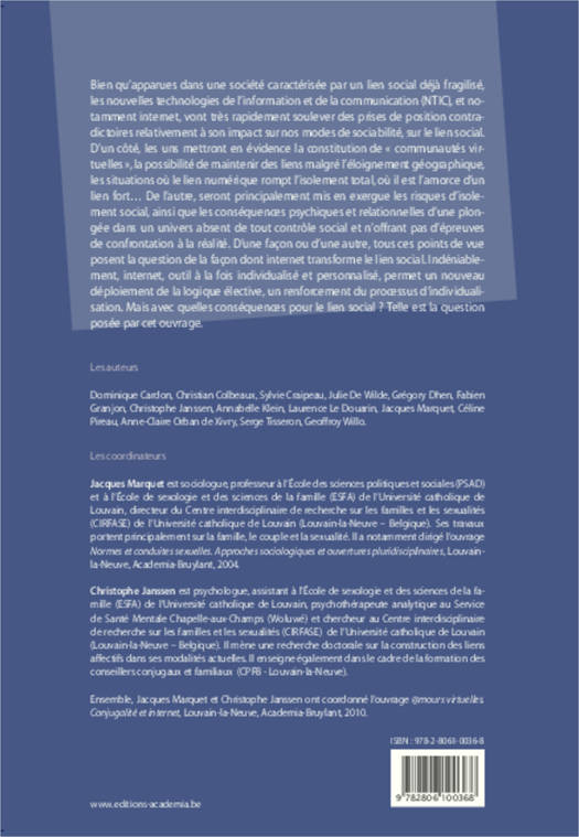Dès son émergence, internet a soulevé des prises de position contradictoires relativement à son impact sur nos modes de sociabilité, sur le lien social : les uns mettant en évidence ses potentialités (rupture de l'isolement, maintien d'un lien à distance ), les autres pointant ses dangers (isolement social, faible confrontation à la réalité...). Indéniablement, internet permet un nouveau déploiement de la logique élective, un renforcement du processus d'individualisation. Mais avec quelles conséquences pour le lien social ? Telle est la question posée par cet ouvrage.