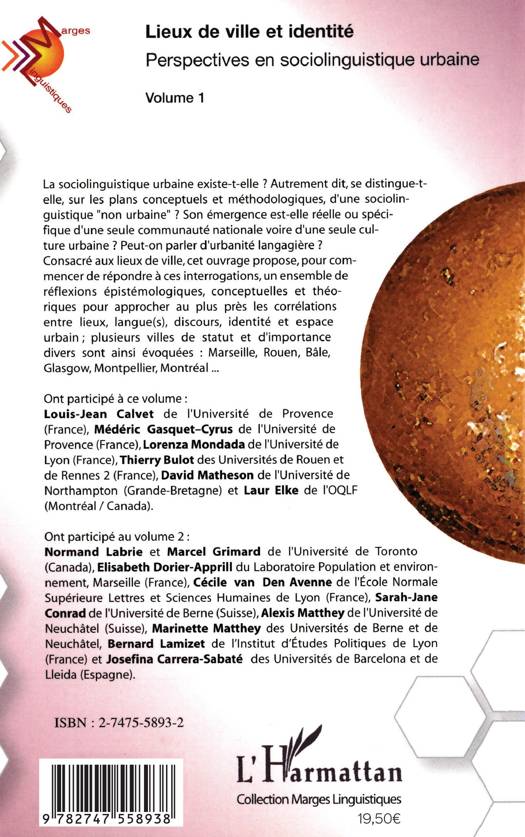La sociolinguistique urbaine existe-t-elle? Autrement dit se distingue-t-elle, sur les plans conceptuels et méthodologiques, d'une sociolinguistique "non urbaine" ? Consacré aux lieux de ville, cet ouvrage propose un ensemble de réflexions épistémologiques pour approcher au plus près les corrélations entre lieux, langue(s), identité et espace urbain. Ce volume évoque entre autres les villes de Marseille, Rouen, Montpellier, Montréal,...