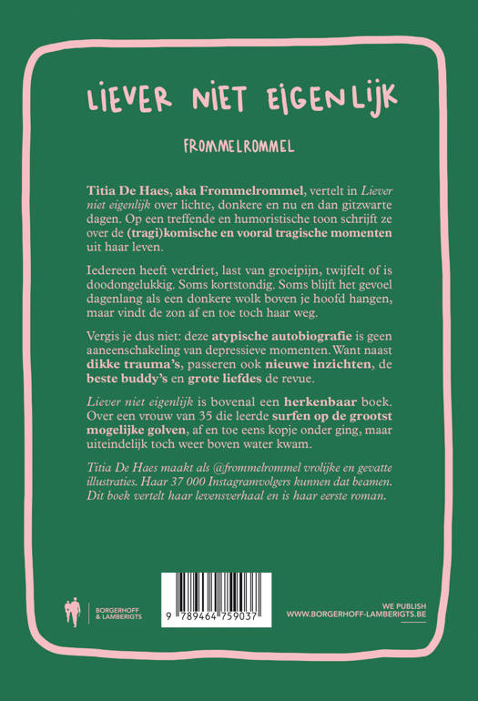 Titia De Haes, aka Frommelrommel, vertelt in Liever niet eigenlijk over lichte, donkere en nu en dan gitzwarte dagen. Op een treffende en humoristische toon schrijft ze over de (tragi)komische en vooral tragische momenten uit haar leven.