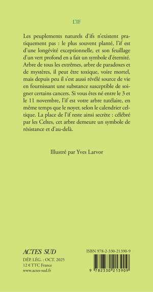 Une nouvelle édition avec rabats, sur papier de qualité, pour une collection emblématique « Le Nom de l'arbre » qui détaille l'anatomie et les besoins de chaque espèce et dévoile leur personnalité symbolique et leur place dans notre imaginaire. Chargé de symboles dans les cimetières, orgueil d'ornement dans les parcs, l'if, à l'exceptionnelle longévité, est l'arbre des extrêmes et des mystères.