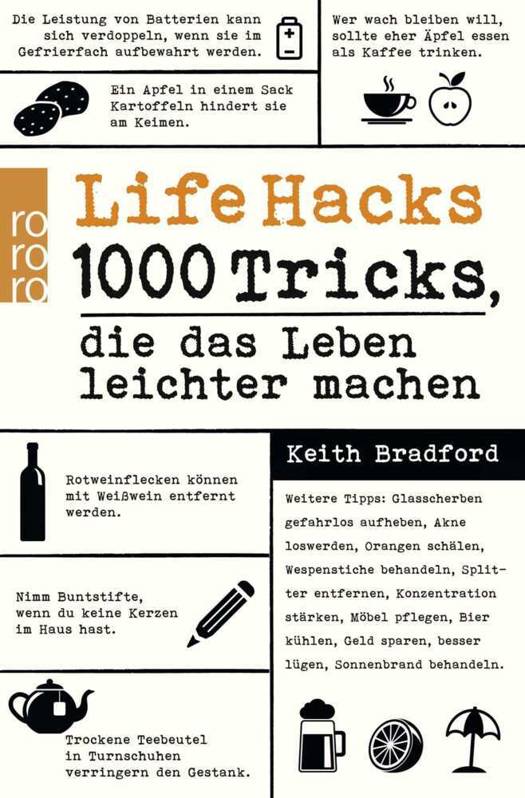 Mundgeruch loswerden, sich vor Gewittern retten, Glasscherben gefahrlos aufhebt, Wespenstiche behandeln und Bier in zwei Minuten kühlen: alles kein Problem mit den «Life Hacks». Keith Bradford sammelt die 1000 lustigsten und cleversten Tricks, die das Leben erleichtern - und erstaunlich einfach sind. Sie bekommen Antworten auf Fragen, die Sie sich schon immer gestellt haben, und Hilfe für jede Lebenslage.