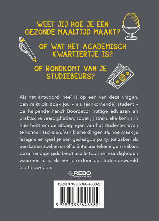 Weet jij hoe je een gezonde maaltijd maakt? Of wat het academisch kwartiertje is? Of rondkomt van je studiebeurs? Als het antwoord ‘nee’ is op een van deze vragen, dan reikt dit boek jou – als (aankomende) student – de helpende hand! Boordevol nuttige adviezen en praktische vaardigheden, zodat jij straks alle kennis in huis hebt om de uitdagingen van het studentenleven te kunnen tackelen. Van kleine dingen als hoe maak je lasagne en geef je een geslaagde party, tot zaken als een kamer zoeken en efficiënter aantekeningen maken: deze handige gids biedt je alle tools en vaardigheden waarmee je je als een pro door de studentenwereld leert bewegen.