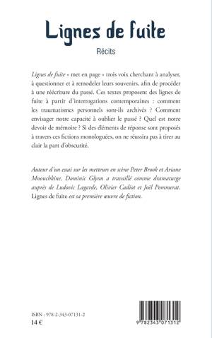 Lignes de fuite « met en page » trois voix cherchant à analyser, à questionner et à remodeler leurs souvenirs, afin de procéder à une réecriture du passé. Ces textes proposent des lignes de fuite à partir d'interrogations contemporaines : comment les traumatismes personnels sont-ils archivés ? Comment envisager notre capacité à oublier le passé ? Quel est notre devoir de mémoire ? Si des éléments de réponse sont proposés à travers ces fictions monologuées, on ne réussira pas à tirer au clair la part d'obscurité.