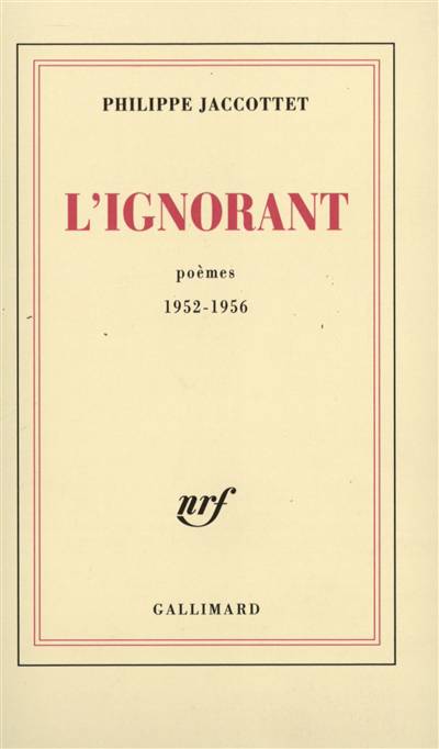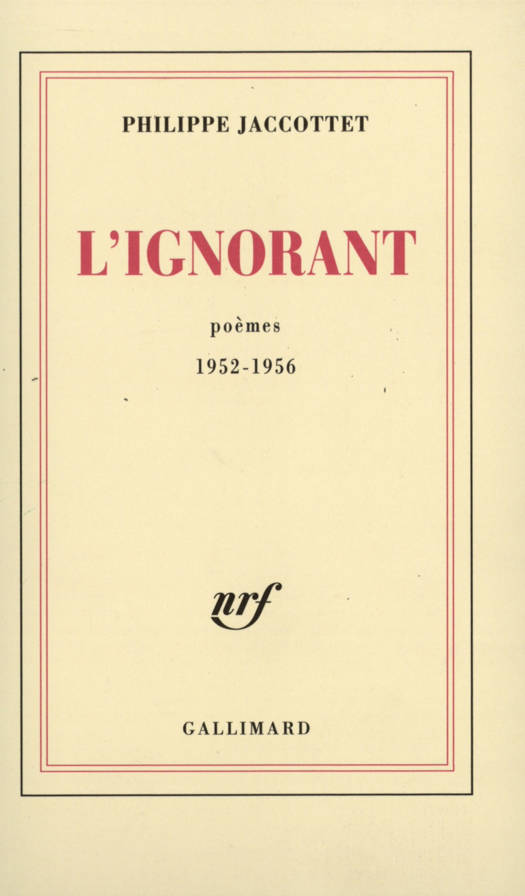 "Plus je vieillis et plus je croîs en ignorance, plus j'ai vécu, moins je possède et moins je règne." "Comme le feu, l'amour n'établit sa clarté que sur la faute et la beauté des bois en cendres." Ces vers ouvrent et ferment le poème intitulé L'Ignorant qui donne son titre au nouveau recueil de poésies de Philippe Jaccottet. Ils indiquent admirablement la recherche philosophique et poétique qui domine l'oeuvre que nous donne aujourd'hui l'auteur de L'Effraie. Les trois "livres" de ce volume (Dans les rues d'une ville - Paroles dans l'air - Le livre des morts), composés respectivement de 13, 20 et 7 poèmes, prouvent que l'unité profonde d'inspiration, la rigueur et l'originalité d'expression, la sobriété dans la richesse demeurent les qualités maîtresses du poète.
