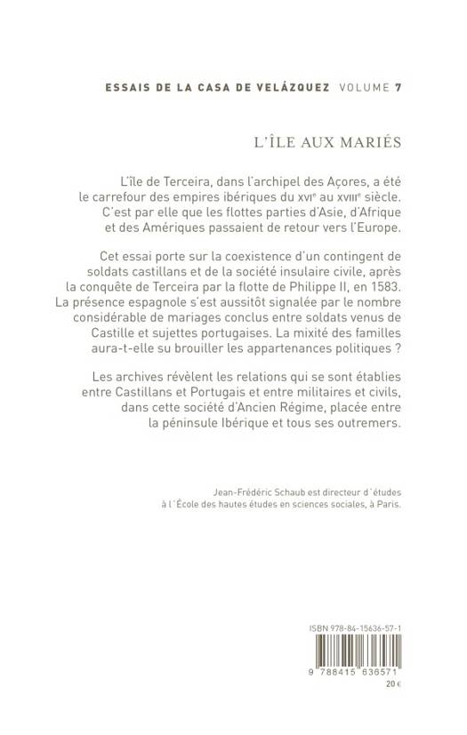 L'île de Terceira, dans l'archipel des Açores, a été le carrefour des empires ibériques du XVIe au XVIIIe siècle. C'est par elle que les flottes parties d'Asie, d'Afrique et des Amériques passaient de retour vers l'Europe. Cet essai porte sur la coexistence d'un contingent de soldats castillans et de la société insulaire civile, après la conquête de Terceira par la flotte de Philippe II, en 1583. La présence espagnole s'est aussitôt signalée par le nombre considérable de mariages conclus entre soldats venus de Castille et sujettes portugaises. La mixité des familles aura-t-elle su brouiller les appartenances politiques ? Les archives révèlent les relations qui se sont établies entre Castillans et Portugais et entre militaires et civils, dans cette société d'Ancien Régime, placée entre la péninsule Ibérique et tous ses outremers.