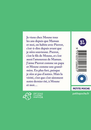 Je viens chez Moune tous les ans depuis que Maman et moi, on habite avec Pierrot, c'est-à-dire depuis avant que je m'en souvienne. Pierrot, c'est le fils de Moune, et c'est aussi l'amoureux de Maman. J'aime Pierrot comme un papa et Moune comme une grand-mère. En plus fort, puisque je n'en ai pas d'autres. Mais la vérité, c'est que c'est sûrement notre dernier été, à Moune et moi...