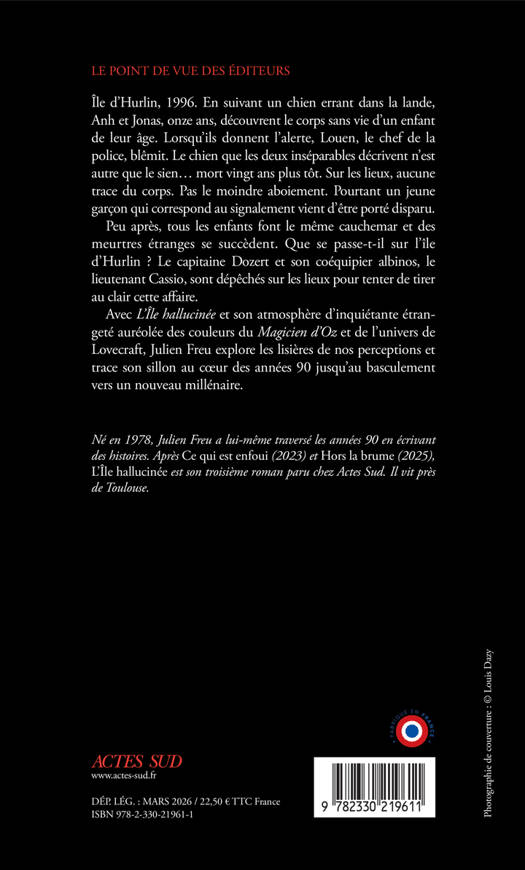 Île d'Hurlin, 1996. En suivant un chien errant dans la lande, Anh et Jonas, onze ans, découvrent le corps sans vie d'un enfant de leur âge. Lorsqu'ils donnent l'alerte, Louen, le chef de la police, blêmit. Le chien que les deux inséparables décrivent n'est autre que le sien... mort vingt ans plus tôt. Sur les lieux, aucune trace du corps. Pas le moindre aboiement. Pourtant un jeune garçon qui correspond au signalement vient d'être porté disparu. Peu après, tous les enfants font le même cauchemar et des meurtres étranges se succèdent. Que se passe-t-il sur l'île d'Hurlin ? Le capitaine Dozert et son coéquipier albinos, le lieutenant Cassio, sont dépêchés sur les lieux pour tenter de tirer au clair cette affaire. Avec "L'Île hallucinée" et son atmosphère d'inquiétante étrangeté auréolée des couleurs du "Magicien d'Oz" et de l'univers de Lovecraft, Julien Freu explore les lisières de nos perceptions et trace son sillon au coeur des années 90 jusqu'au basculement vers un nouveau millénaire.
