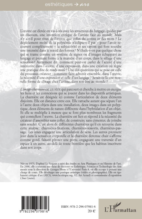 L'image-charnière considère l'art contemporain (installations, dispositifs, montages cinématographiques) dans les liens et les articulations qui s'y tissent. D'une part ceux-ci relèvent d'une nature discursive, de ce qui appartient à l'"il", de l'autre, ils engagent l'uvre en tant que corps vibrant, caisse de résonance à l'égard du monde que cherche à faire émerger le parcours du regard.