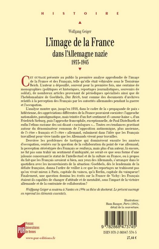L’analyse montre que, jusqu’en 1938, dans le cadre de la « propagande de paix » hitlérienne, des appréciations différentes de la France pouvaient coexister : l’approche nationaliste, paradigmatique, mais teintée d’un fort sentiment d’« amour-haine », d’un Friedrich Sieburg, puis l’approche francophile, exceptionnelle, de Paul Distelbarth et enfin l’ethno-racisme des soi-disant « raciologues »… Toutes ces tendances gravitant autour du dénominateur commun de l’opposition antinomique, plus ancienne, de l’« être » français et de l’« être » allemand, culminent dans l’idée que les Français travaillent pour vivre tandis que les Allemands vivent pour travailler.