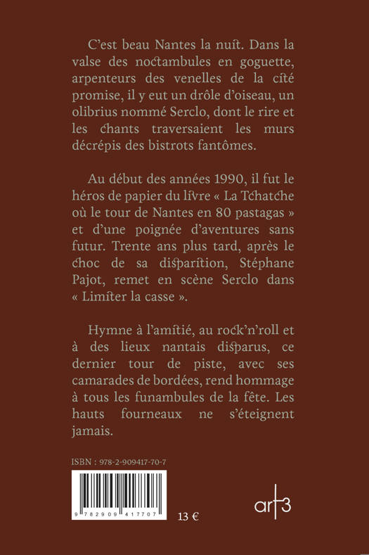 Au début des années 1990, il fut le héros de papier du livre « La Tchatche ou le tour de Nantes en 80 pastagas » et d’une poignée d’aventures sans futur. Trente ans plus tard, après le choc de sa disparition, Stéphane Pajot, remet en scène Serclo dans «Limiter la casse».Hymne à l’amitié, au rock’n’roll et à des lieux nantais disparus, ce dernier tour de piste, avec ses camarades de bordées, rend hommage à tous les funambules de la fête. Les hauts fourneaux ne s’éteignent jamais.