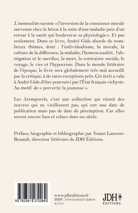 L'immoraliste raconte l'inversion de la conscience morale survenue chez le héros à la suite d'une maladie puis d'un retour à la santé qui bouleverse sa physiologie . Et pas seulement. Dans ce livre, André Gide aborde de nombreux thèmes, dont: l'individualisme, la morale, la culture de la différence, la maladie, l'homosexualité, l'abnégation et le sacrifice, la mort, la contrainte sociale, le voyage, le vice et l'hypocrisie. Dans le monde littéraire de l'époque, le livre sera globalement très mal accueilli par la critique, à de rares exceptions près. Cet écrit a valu à André Gide d'être poursuivi par l'État français vichyste. Au motif de pervertir la jeunesse . Les Atemporels, c'est une collection qui réunit des oeuvres qui ne vieillissent pas, qui ont une date de publication mais pas de date de péremption. Car elles seront encore lues et relues dans un siècle. Préface, biographie et bibliographie par Yoann Laurent-Rouault, directeur littéraire de JDH Éditions.