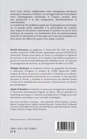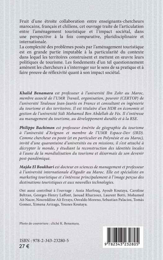 Fruit d’une étroite collaboration entre enseignants-chercheurs marocains, français et chiliens, cet ouvrage traite de l’articulation entre l’aménagement touristique et l’impact sociétal, dans une perspective à la fois comparative, pluridisciplinaire et internationale. La complexité des problèmes posés par l’aménagement touristique est en grande partie imputable à la particularité du contexte dans lequel les territoires construisent et mettent en œuvre leurs politiques de tourisme. Les fondements d’un tel questionnement amènent les chercheurs à s’interroger sur le sens de sa pratique et à faire preuve de ré¬flexivité quant à son impact sociétal.